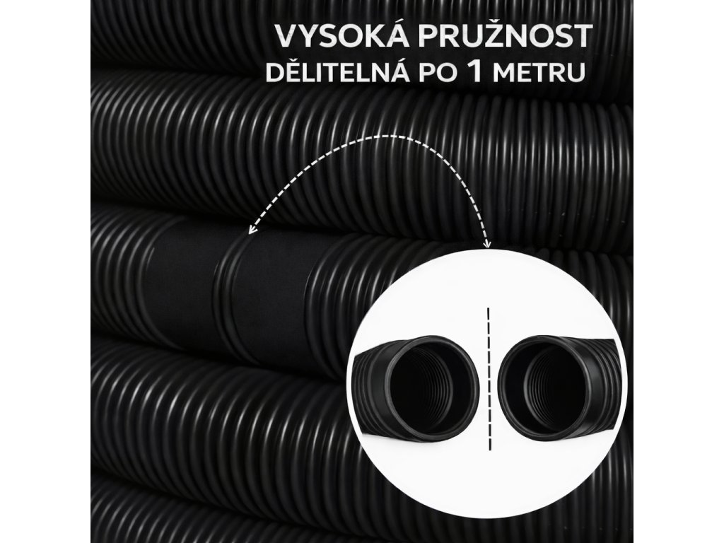 Naše hadice je vyrobena z kombinace HDPE a LDPE, což zajišťuje její odolnost a flexibilitu. Díky tomu je ideální pro každodenní použití a odolává i náročným podmínkám. Černá barva hadice navíc minimalizuje viditelnost nečistot a dokonale zapadne do každého prostředí.