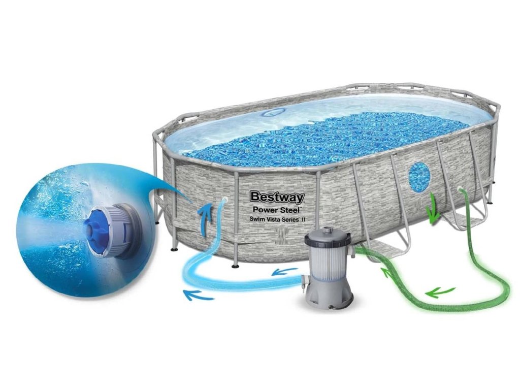Bazén oválného tvaru s nosnou kovovou částí, která má antikorozní úpravu. Boční stěny z třívrstvého PVC a polyesteru. Integrovaný ventil pro regulaci vypouštění pomocí zahradní hadice. Bestway 56714 Swim Vista Series Oval Pool Set má vodní kapacitu o 7 250 l a je vybaven Seal & Lock systémem.