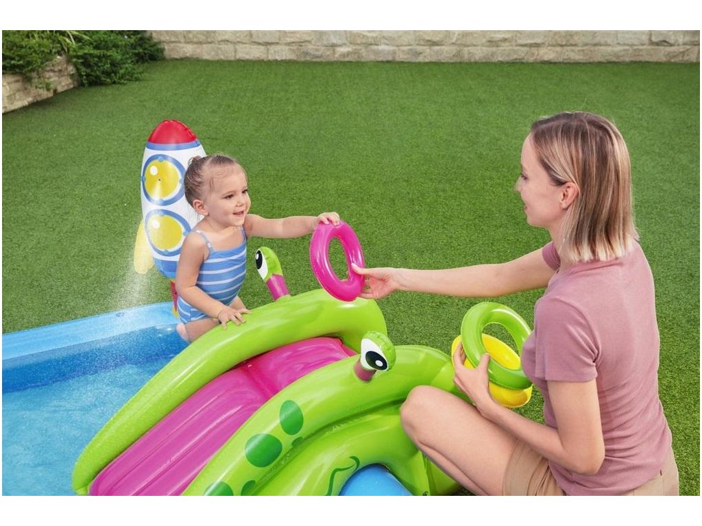 Multifunkční zábava: Tento vodní park kombinuje hrací bazén, vodní stříkačku, klouzačku s měkkou podložkou pro bezpečné přistání, a další hry jako házení kroužků a frisbee. Děti si užijí hodiny zábavy, zatímco se bezpečně ochladí ve vodě.