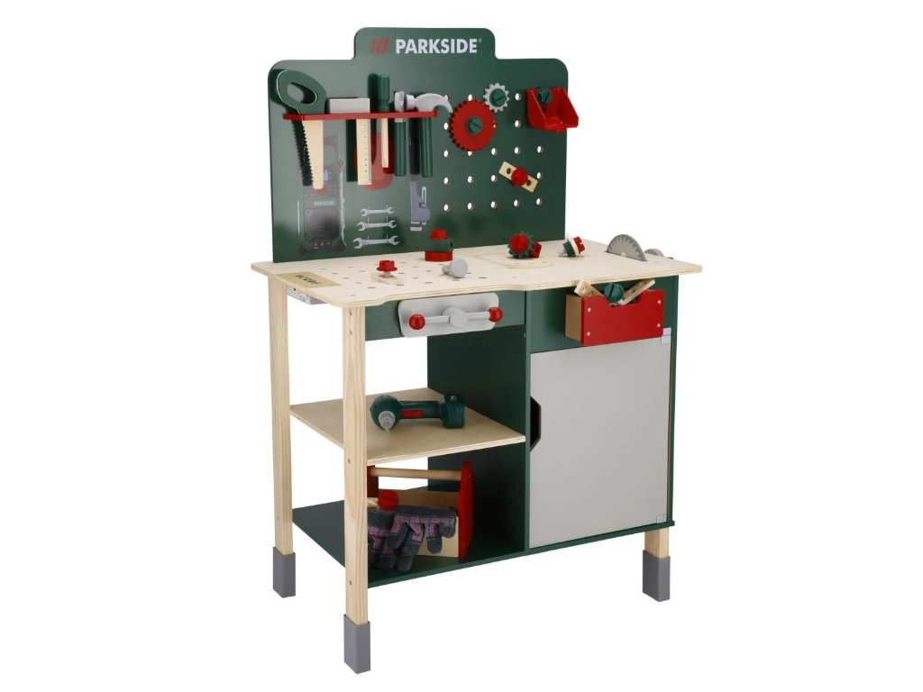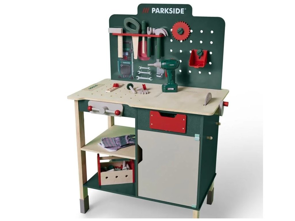 Tento pracovní stůl obsahuje realistické nářadí, které je navrženo speciálně pro dětské ruce. Elektrický akumulátorový šroubovák se změnou směru otáčení, otáčející se pila a funkční svěrák umožní malým kutilům opravovat a tvořit. Navíc se děti mohou těšit na čtyři realistické zvuky – řezání, vrtání, broušení a tlučení – které přidají na autentičnosti jejich her.