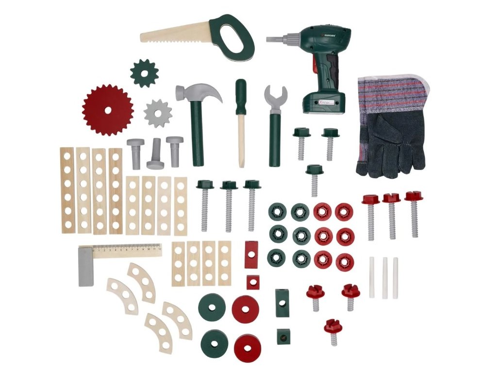 Součástí balení je celkem 74 dílů, včetně rukavic, dřevěné pily, kladiva, klíče, šroubováku a úhlového pravítka. To vše je navrženo tak, aby podporovalo kreativitu a zručnost vašich dětí.