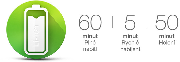Společnost Braun do holicího strojku zabudovala kvalitní Li-Ion baterii, jenž představuje naprostý komfort v dlouhodobém používání bez nutnosti neustálého nabíjení. Zařízení tak vydrží na jedno hodinové nabíjení až 3 týdnu v provozu, neboli cca 50 min čistého času. V případě nutnosti rychlého oholení je k dispozici i možnost rychlého nabití, což trvá 5 min a můžete opět začít s úpravou vousů.