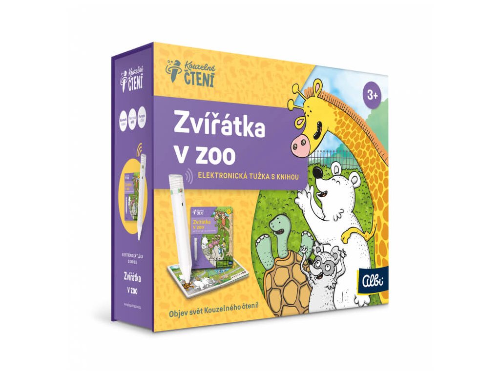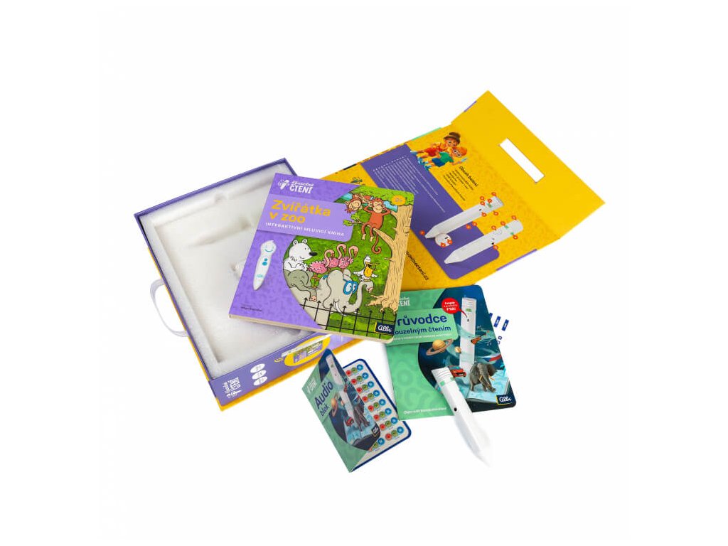 Sada Albi tužka 2.0 s knihou Zvířátka v ZOO obsahuje: Elektronickou Albi tužku 2.0, knihu Zvířátka v ZOO, nabíječku, USB-C kabel, Průvodce Kouzelným čtením, 10 kusů samolepek MP3 přehrávače, 10 kusů samolepek ovládání hlasitosti a Audio blok.