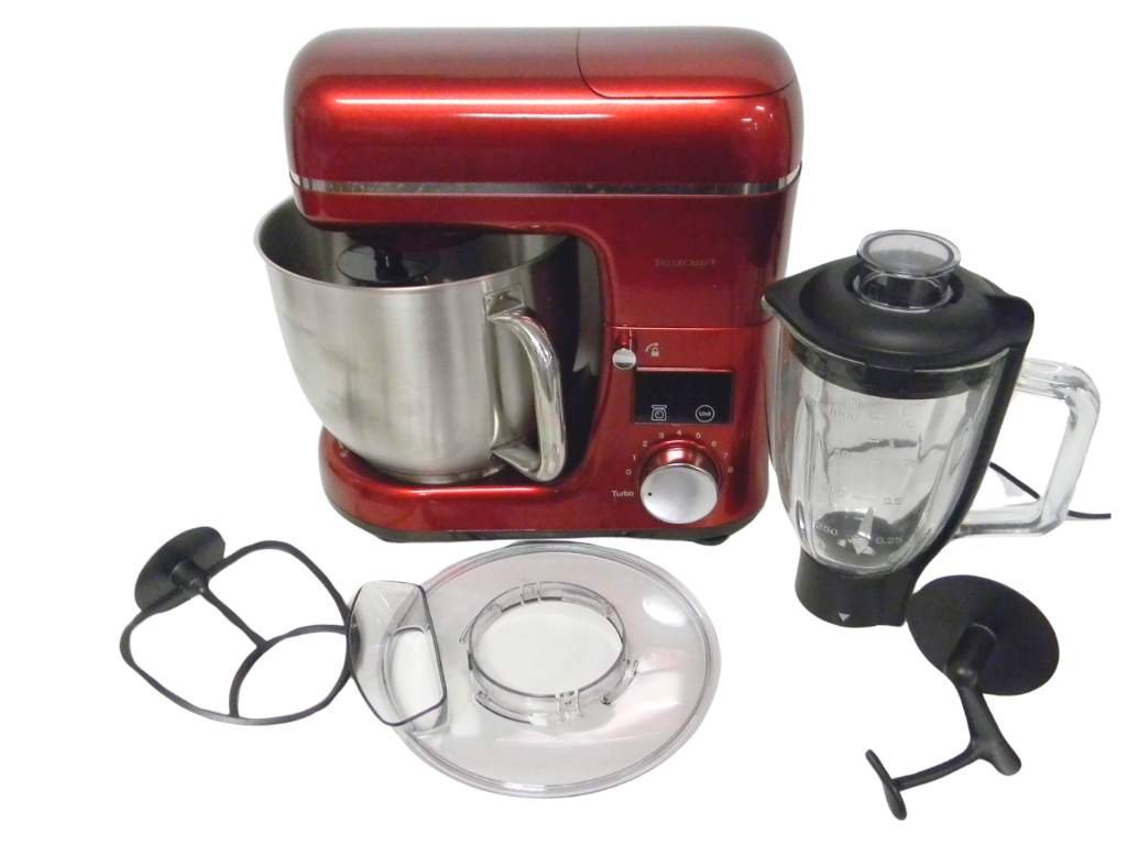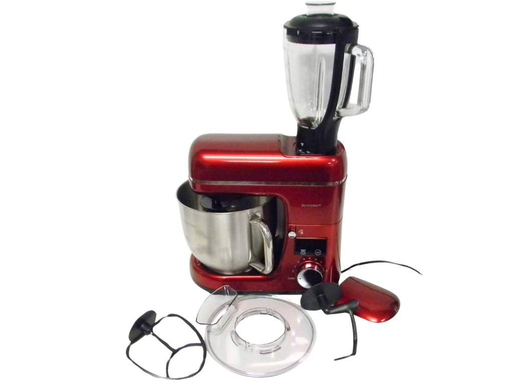 - Včetně ochrany proti stříkání s otvorem na plnění, skleněné nádoby na mixování, hnětacího háku, metly na šlehání a míchání