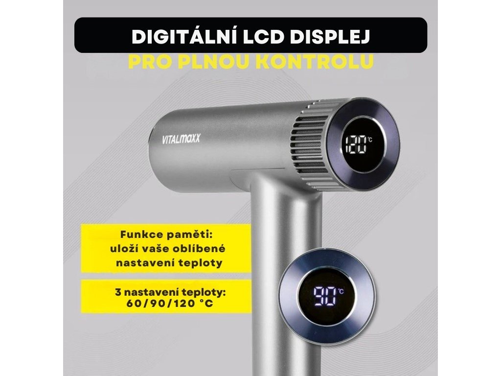 Integrovaný digitální LCD displej zobrazuje aktuální teplotu, kterou můžete nastavit ve třech úrovních (60 °C, 90 °C, 120 °C), zatímco dva rychlostní režimy (82 000 a 110 000 ot./min) umožňují přizpůsobit výkon vašim potřebám. Díky paměťové funkci si fén zapamatuje vaši oblíbenou nastavení, což zajišťuje konzistentní výsledky při každém použití.