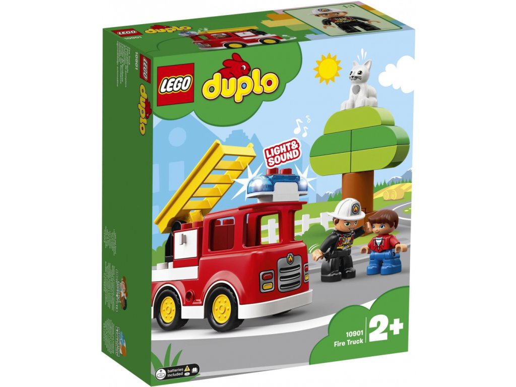 - 2 LEGO® DUPLO® figurky: hasiče a dítě, a k tomu navíc figurku kočky.