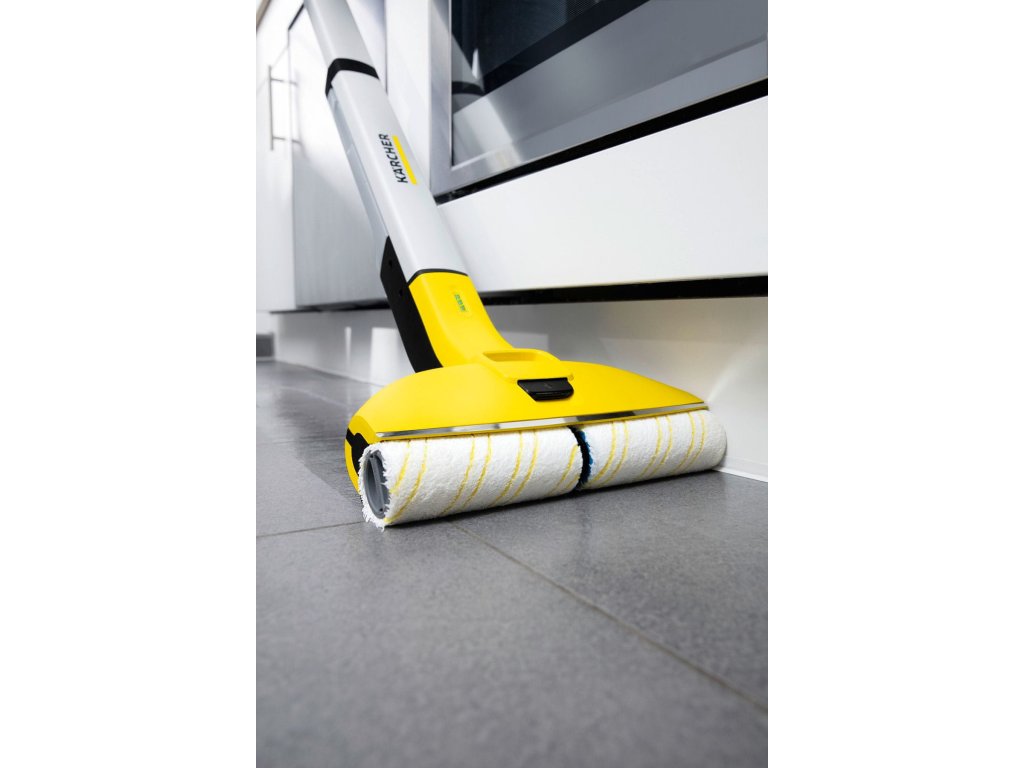 Revoluční bateriová podlahová myčka KÄRCHER FC 3 Cordless na perfektní vytírání. Nečistoty jsou schromažďovány v nádobkách umístěných za válci. Rotující válce neustále zvlhčuje čistá voda, zatímco se vytřené nečistoty dostanou do nádrže špinavé vody. Vytíráte tedy stále čistou vodou, nečistoty se tan neroznášejí, ale jsou uzavřeny v nádrži na špinavou vodu.