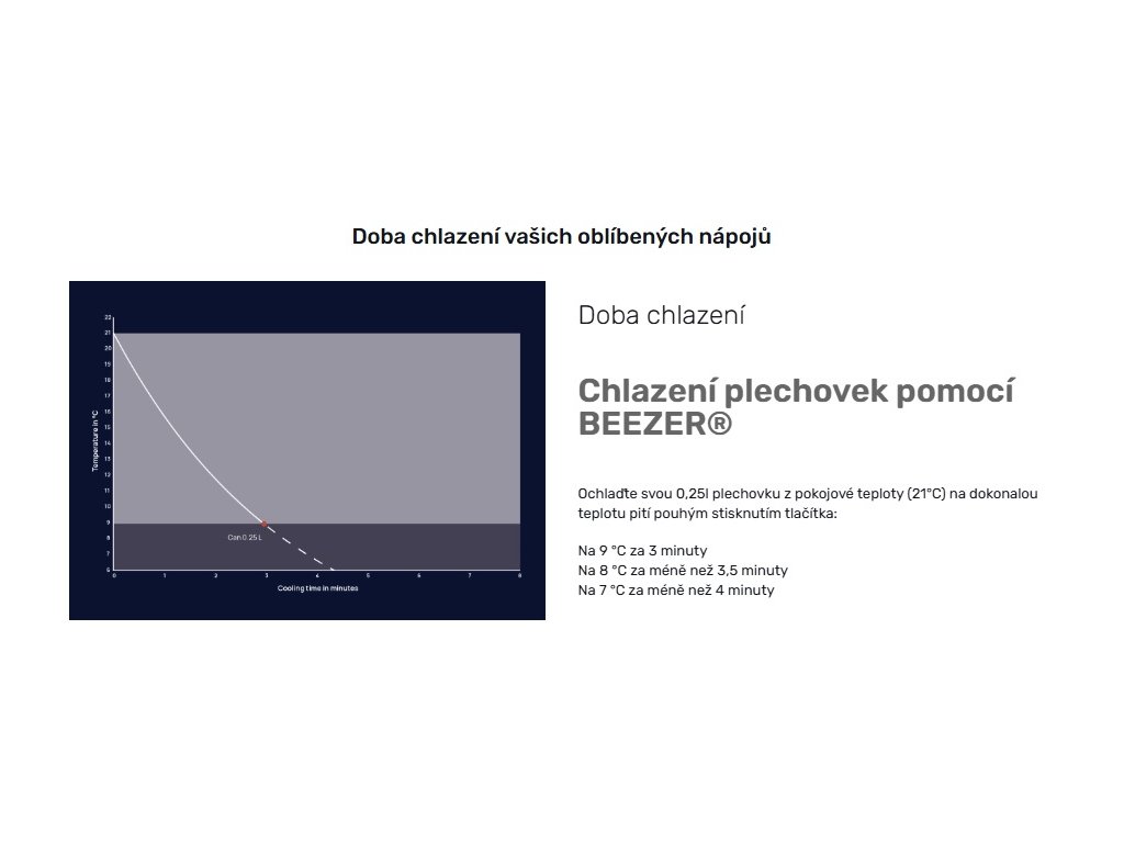 Chladící box BEEZER® dokáže ochladit nápoj z pokojové teploty na méně než 9 °C za pouhé 3 minuty pro 0,25l, 4 minuty pro 0,50l a 6 minut pro 0,75l lahve. To je 10x rychleji než mraznička. Díky této rychlosti ušetříte nejen čas, ale také energii. Chlazení „na vyžádání“ spotřebovává elektrickou energii pouze tehdy, když chlazení nápoje skutečně probíhá, což je velmi efektivní a šetrné k životnímu prostředí.