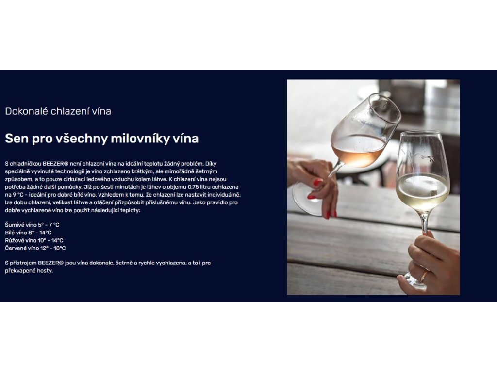 Pro všechny milovníky vína je BEEZER® snem. Chladí víno na ideální teplotu rychle a šetrně. Například láhev o objemu 0,75 litru je ochlazena na 9 °C během pouhých šesti minut. Díky individuálnímu nastavení lze dobu chlazení, velikost láhve a otáčení přizpůsobit konkrétnímu vínu.
