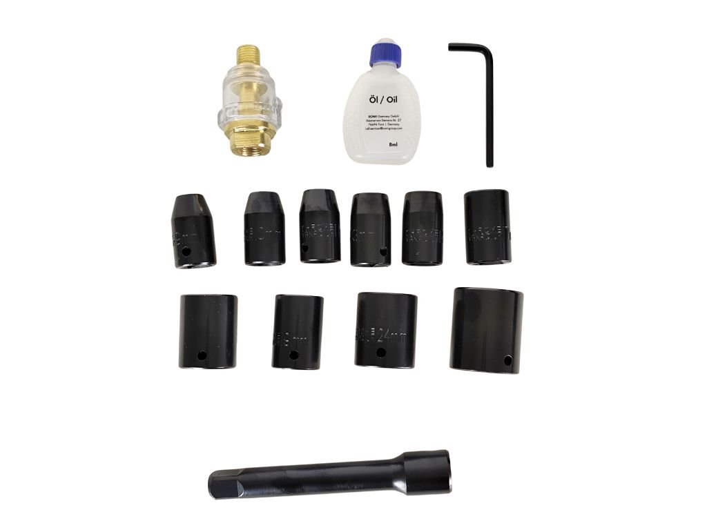 Parkside PDSS 310 C6 přichází s bohatým příslušenstvím, které zahrnuje 10 nástrčných klíčů (velikosti 9, 10, 11, 13, 14, 17, 19, 22, 24, 27), prodlužovací nástavec a nástrčnou spojku ¼" (6,35 mm). Součástí balení je také maznička, lahvička oleje a klíč s vnitřním šestihranem, což zajišťuje, že máte vše, co potřebujete pro okamžité použití.