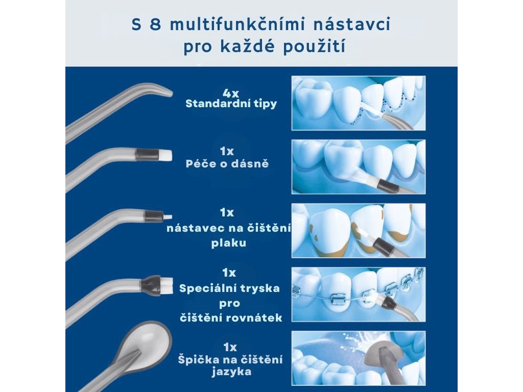 Naše ústní sprcha nabízí 8 různých nástavců, včetně 4 standardních, 1 pro čištění jazyka, 1 speciální trysky, 1 nástavce pro čištění plaku a 1 pro péči o dásně. To znamená, že pokryje všechny potřeby ústní hygieny, ať už jde o odstranění zbytků jídla, péči o zuby s rovnátky, nebo osvěžení dechu.