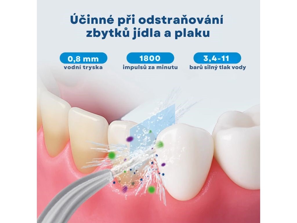 S vysokofrekvenční technologií vodního proudu s 1800 impulzy za minutu a jemným, stabilním proudem vody o průměru 0,8 mm, ústní sprcha účinně odstraňuje zbytky i tam, kde běžné kartáčky často selhávají. To zajišťuje nejen čistotu, ale také svěží dech a zdravé dásně.