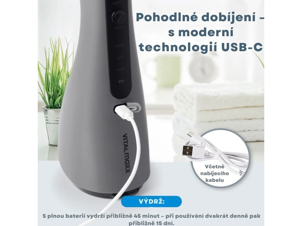 VitalMaxx AKU ústní sprcha je vybavena výkonnou baterií s kapacitou 1300 mAh a velkým 320ml zásobníkem na vodu, což je dostatečné pro kompletní čištění bez nutnosti opětovného plnění. Díky bezdrátovému provozu a snadnému nabíjení přes USB-C se stává ideálním společníkem doma i na cestách.