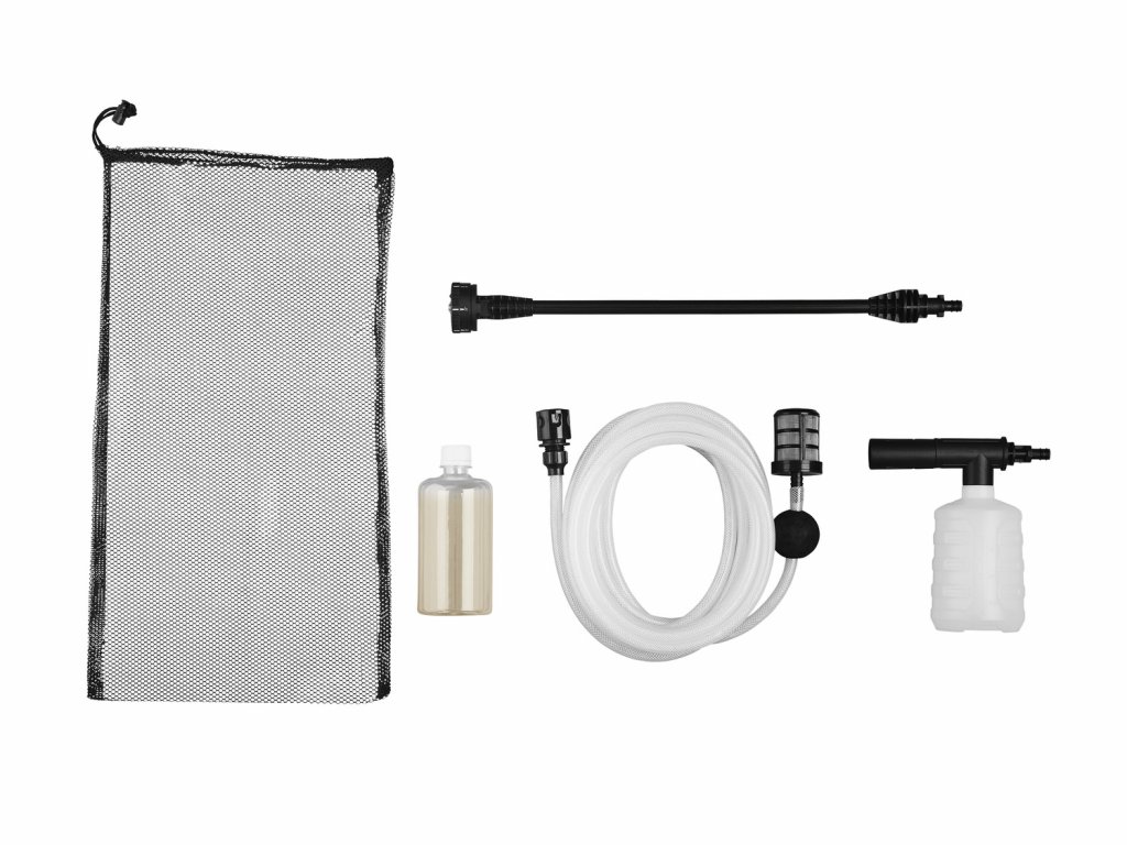 - Dodané příslušenství: 1 postřikovací trubka s praktickou multifunkční tryskou, 1 tryska s nádobkou na čistící prostředek (cca 500 ml), cca 6 m sací hadice s filtračním košíkem, 1 láhev s čistícím prostředkem (cca 500 ml), 1 přepravní síťka
