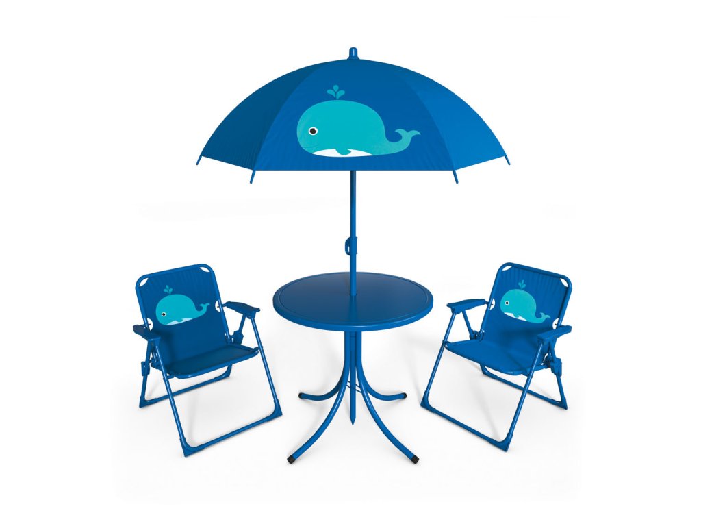 Při dovádění na zahradě si děti rády i tu chvilku posedí a posvačí. Pro takové chvíle tu máme krásnou zahradní sedací sestavu v designu velryby. Set obsahuje stoleček, dvě židle a slunečník.