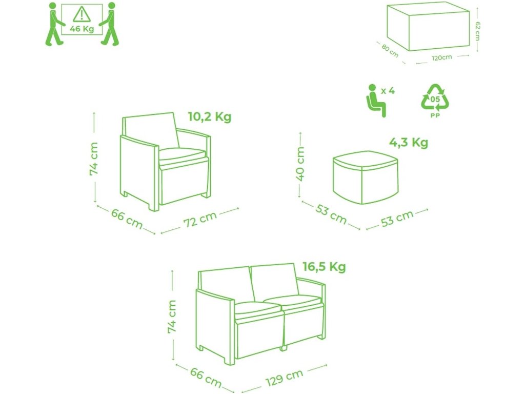 - Křesla: 72 x 66 x 74 cm