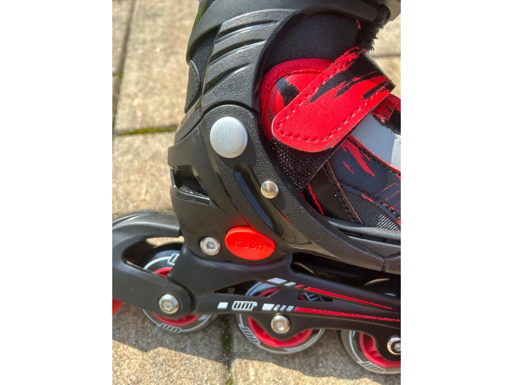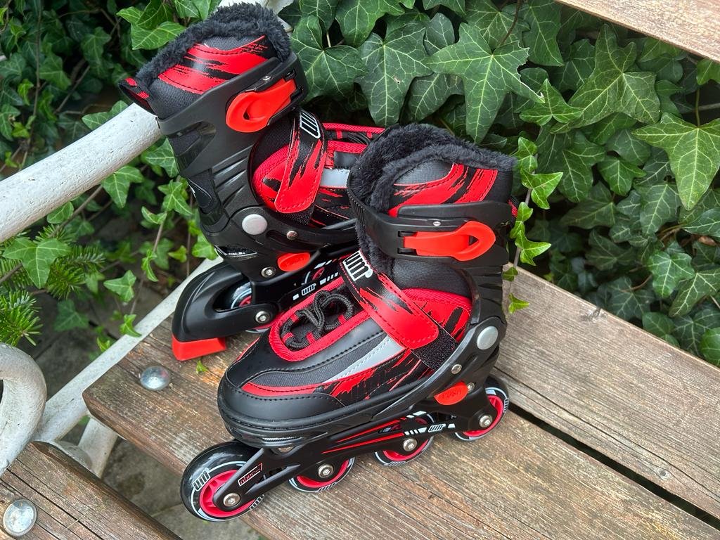 UM Nastavitelné brusle s vyměnitelným podvozkem na lední nebo in-line bruslení EN-13843 vel.: 31-34, červené