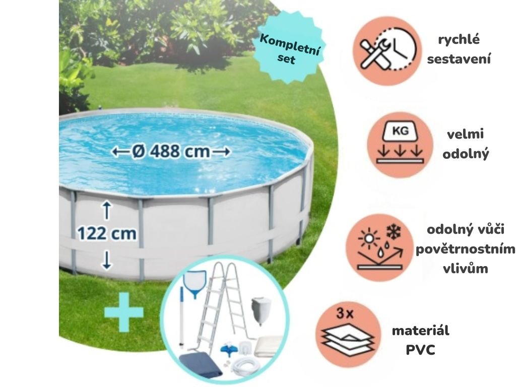 - Rychlá a snadná montáž – Díky intuitivnímu systému je bazén připraven k použití během 60 minut.